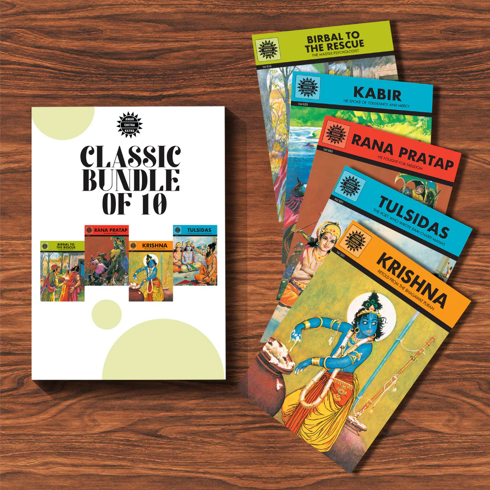 Curated Collection: Immerse yourself in a rich assortment of Indian mythology, history, and folklore with this pack of 10 single title books from Amar Chitra Katha, including tales of Krishna, Tulsidas, Birbal, and more.